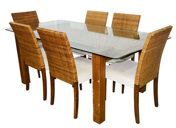 Mesa de jantar com tampo de vidro, base de madeira e detalhe de corda no tampo. Acompanham 6 cadeiras com assentos es...