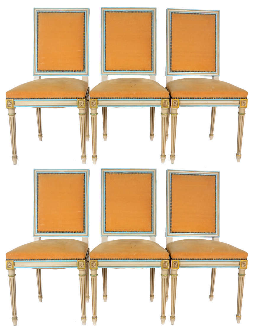 Seis cadeiras de madeira patinada de cor creme e azul com forro em veludo de cor marrom