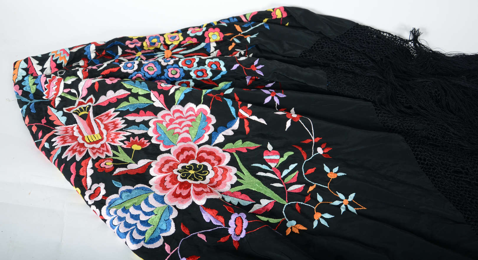 Duas toalhas sendo uma de algodão com apliques florais e uma de linho bege da Ilha da Madeira com bordados coloridos