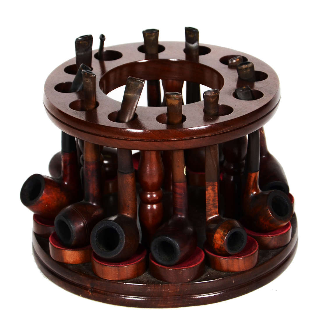 Coleção com 12 cachimbos diversos, acompanha expositor de madeira.