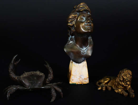Três estatuetas de metal sendo: Leão um caranguejo e um busto feminino altura da peça maior