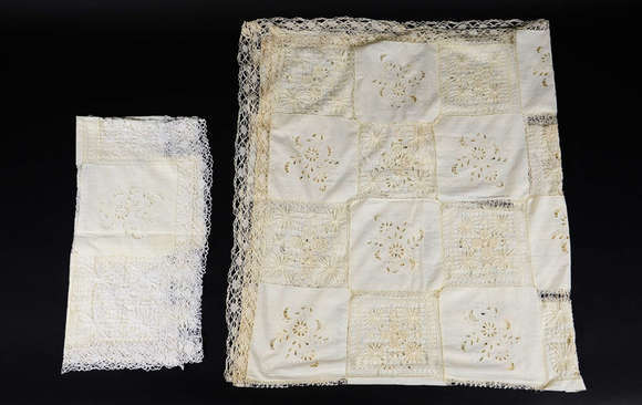 Duas toalhas sendo uma de algodão com apliques florais e uma de linho bege da Ilha da Madeira com bordados coloridos