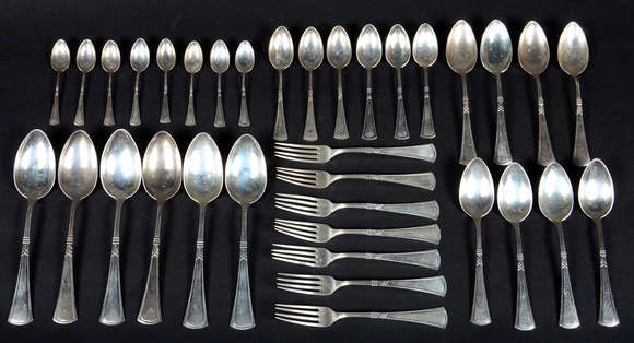 Faqueiro de prata 900 mls contrastado, composto de : 8 colheres de sobremesa, 6 colheres de sopa, 7 garfos, 6 colhere...