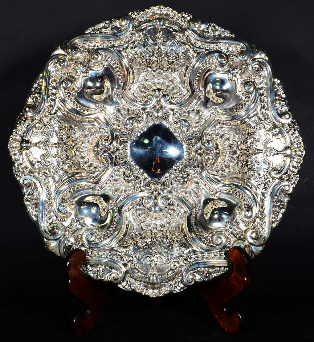 Fruteira redonda de metal prateado, borda com rosas em relevo.