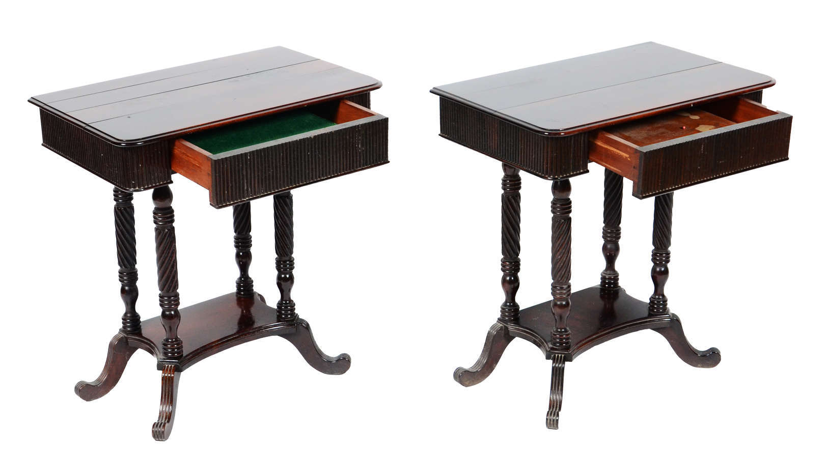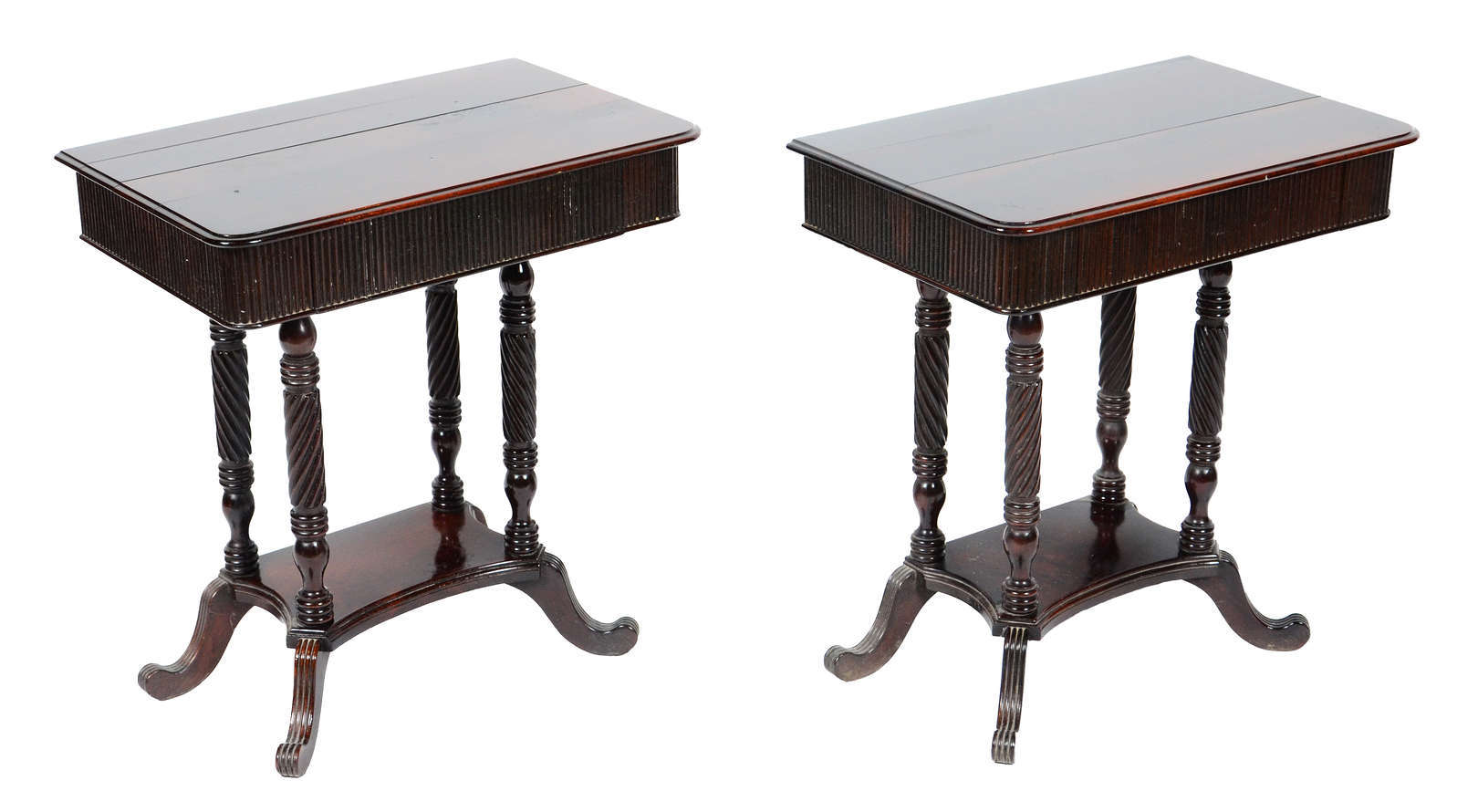 Par de mesinhas auxiliares de madeira nobre com 3 gavetas cada, estilo Chipendale.
