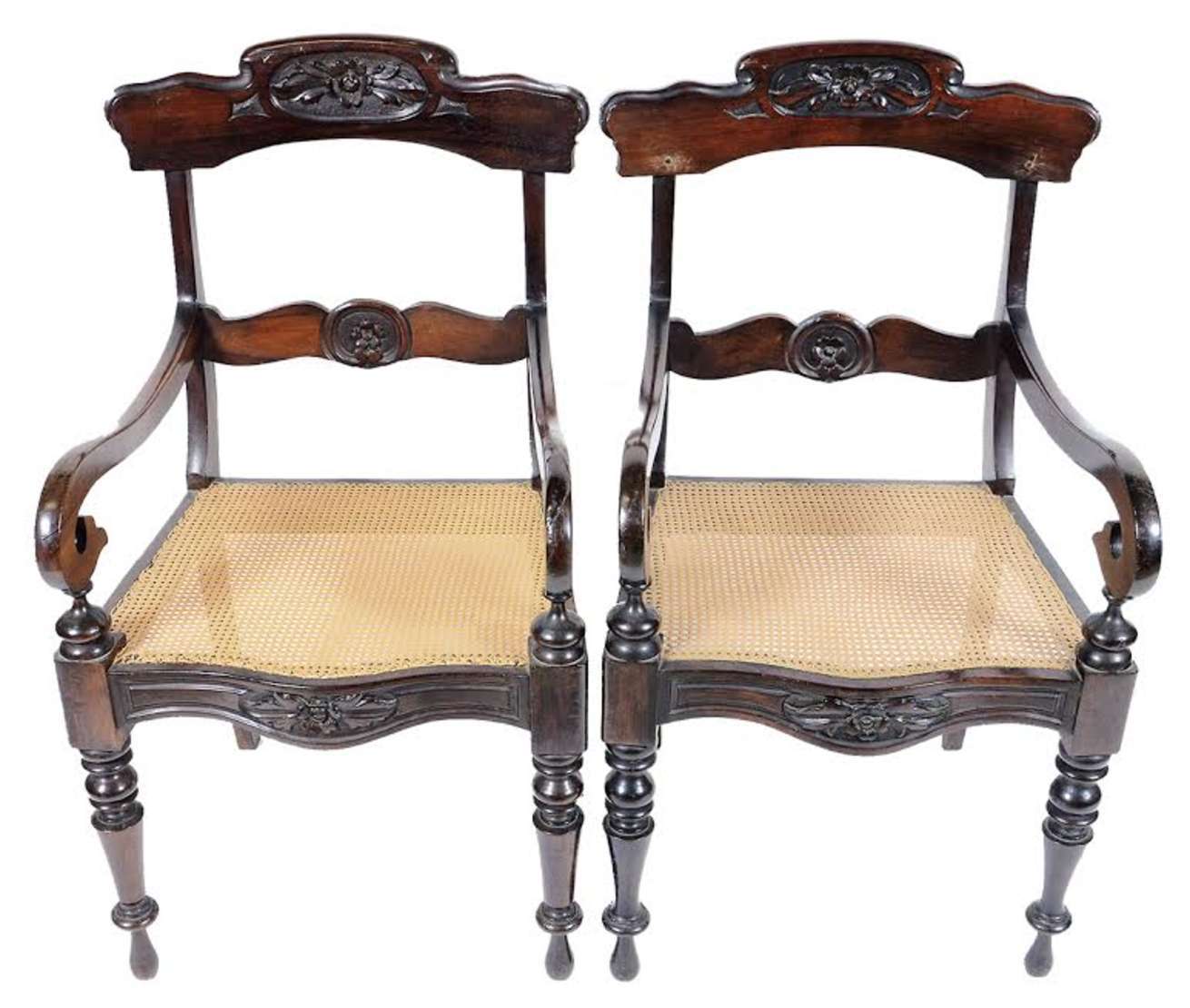 Duas belíssimas e antigas cadeiras com braços, feitio medalhão, de madeira nobre e assentos de palhinha, modelos dif...