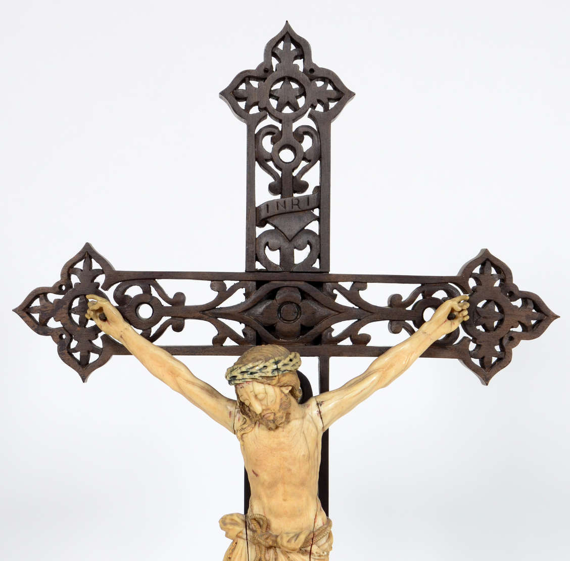 Estatueta de bronze e marfim com base de madeira, representando menino com cesto