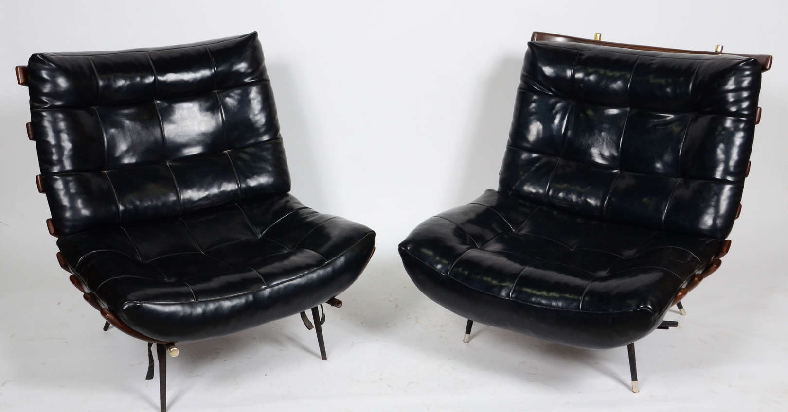 Par de poltronas de madeira nobre com entalhes, assentos e encostos estofados e forrados com tecido na cor bege.