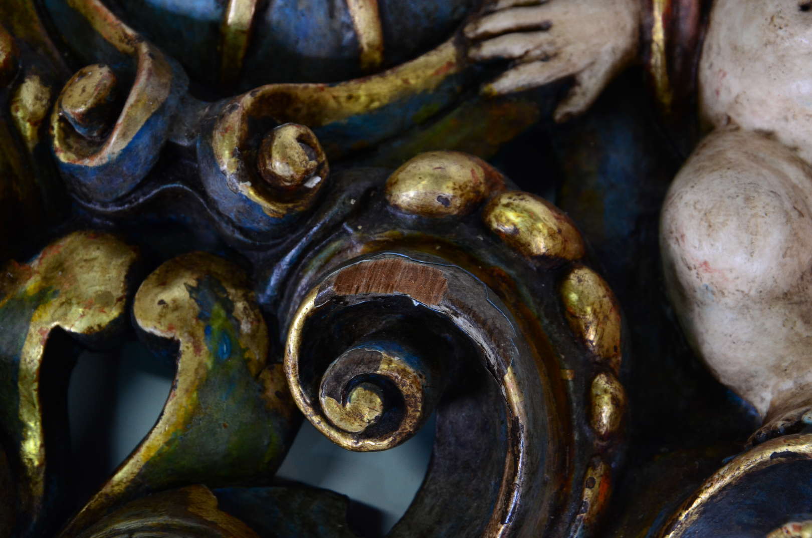 Antiga placa de madeira entalhada e policromada com querubins , realces dourados (pé colado)
