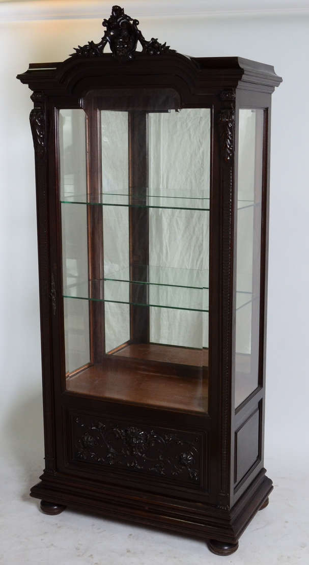Mesa vitrine de jacaranda , saia recortada com entalhes, iluminação interna.