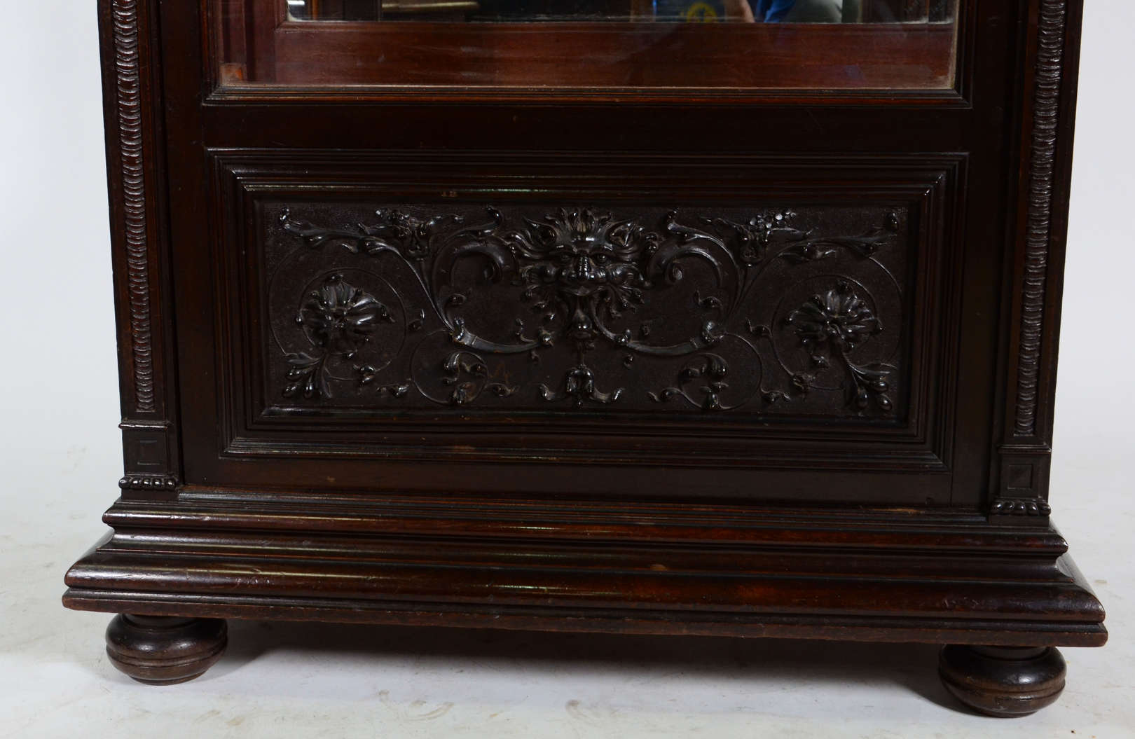 Armário de madeira nobre com 3 portas sendo a central com espelho bisotado, aplicações de bronze.