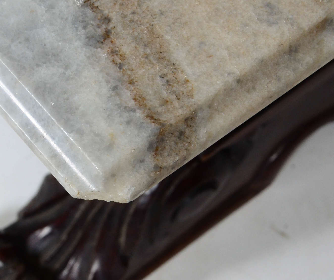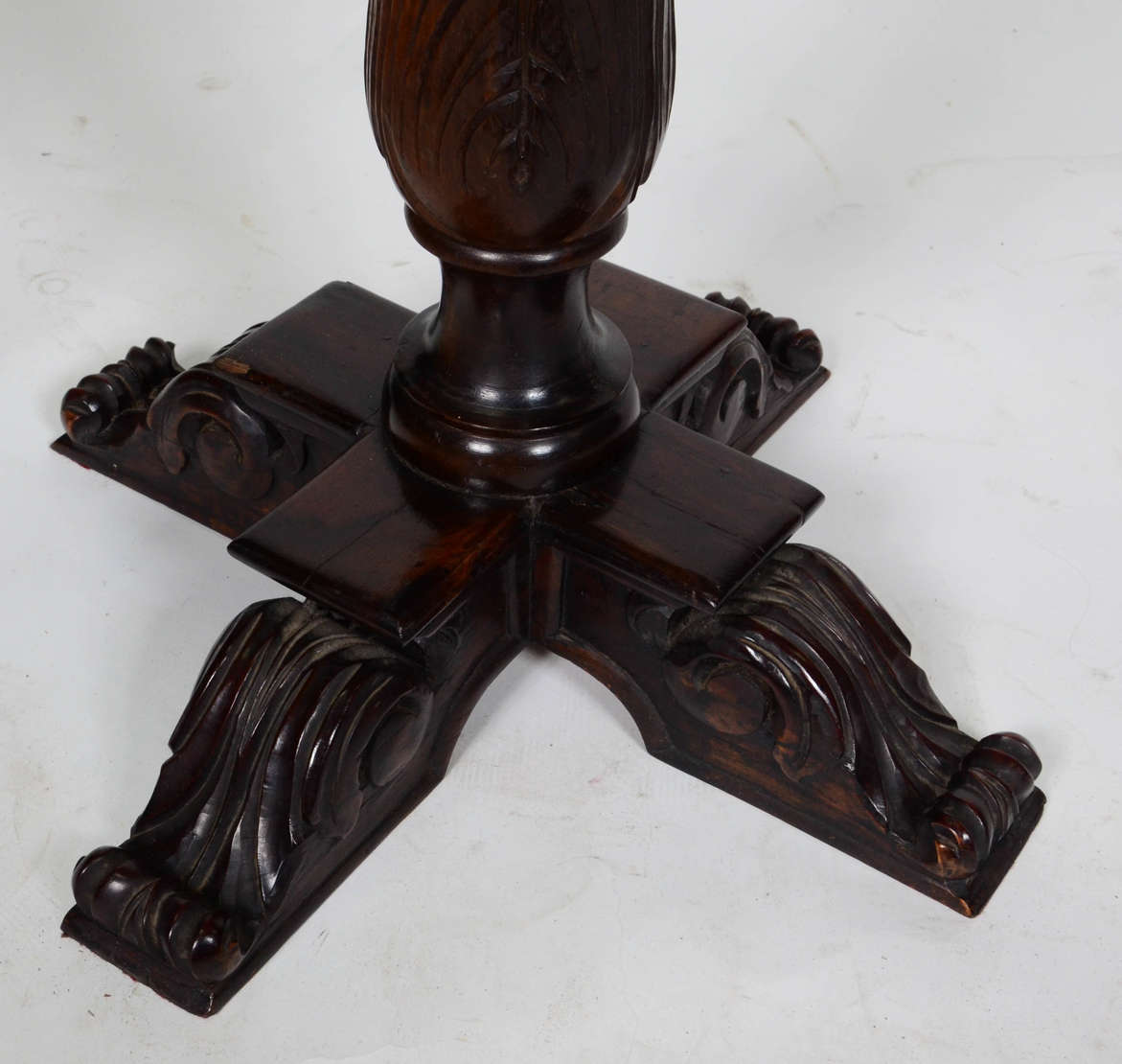 Mesa auxiliar de madeira nobre com pernas torneadas, tampo com folheado ligeiramente enrugado.