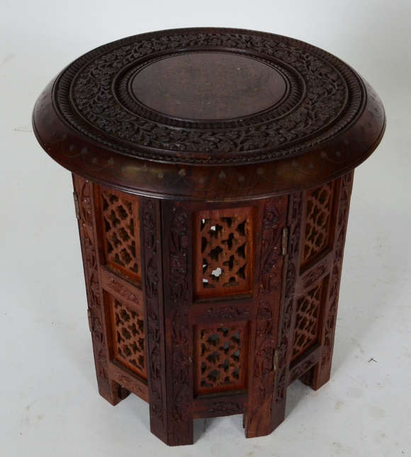 Mesa auxiliar de madeira nobre com pernas torneadas, tampo com folheado ligeiramente enrugado.
