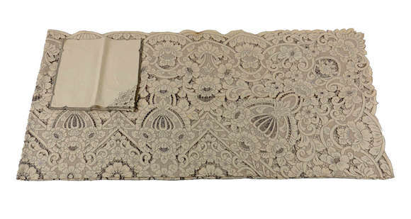 Toalha de mesa da Ilha da Madeira em linho bege ricamente trabalhado com bordados, com 12 guardanapos.