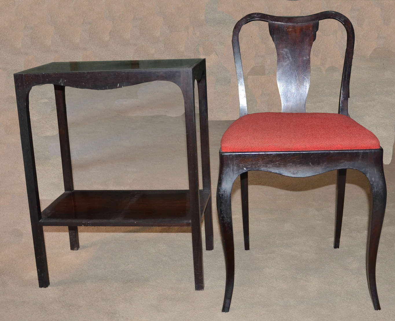 Mesa de encostar de jacarandá, tampo dobrável , duas gavetas, saia recortada e pernas arquedas, medida fechada