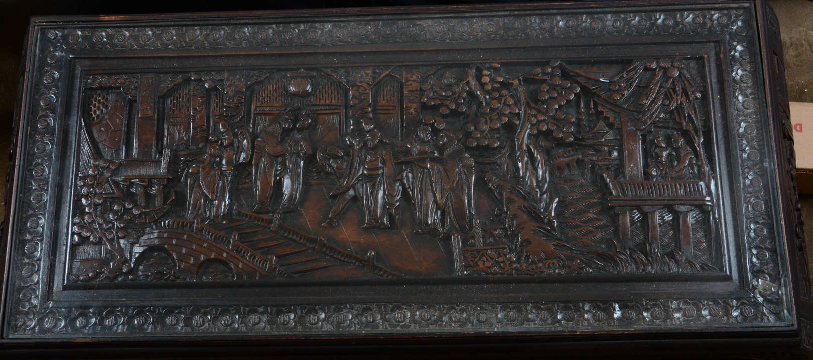 Aparador oriental de lacca preta , três gavetas com puxadores em metal .