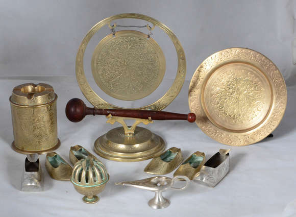 Diversas peças de metal indiano sendo : 7 cinzeiros (dois deles no feitio de sapato são de prata Sterling), um gongo,...