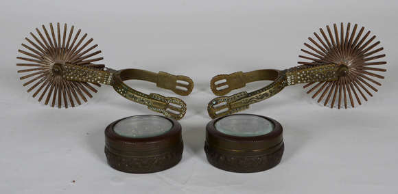 Diversas peças, sendo para de esporas de metal e par de pequenas caixinhas de metal com tampas de vidro.