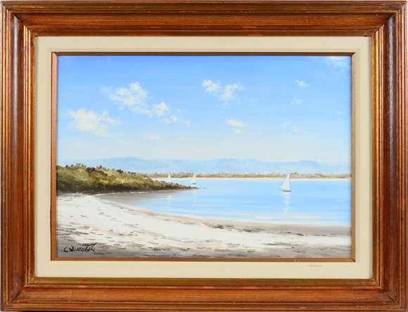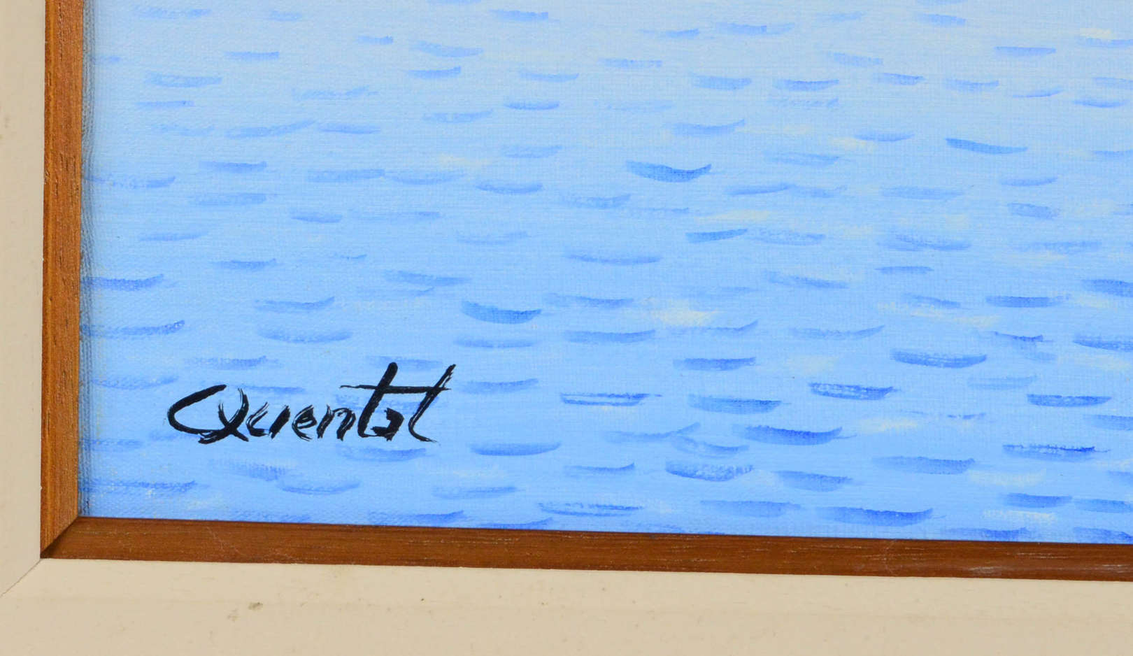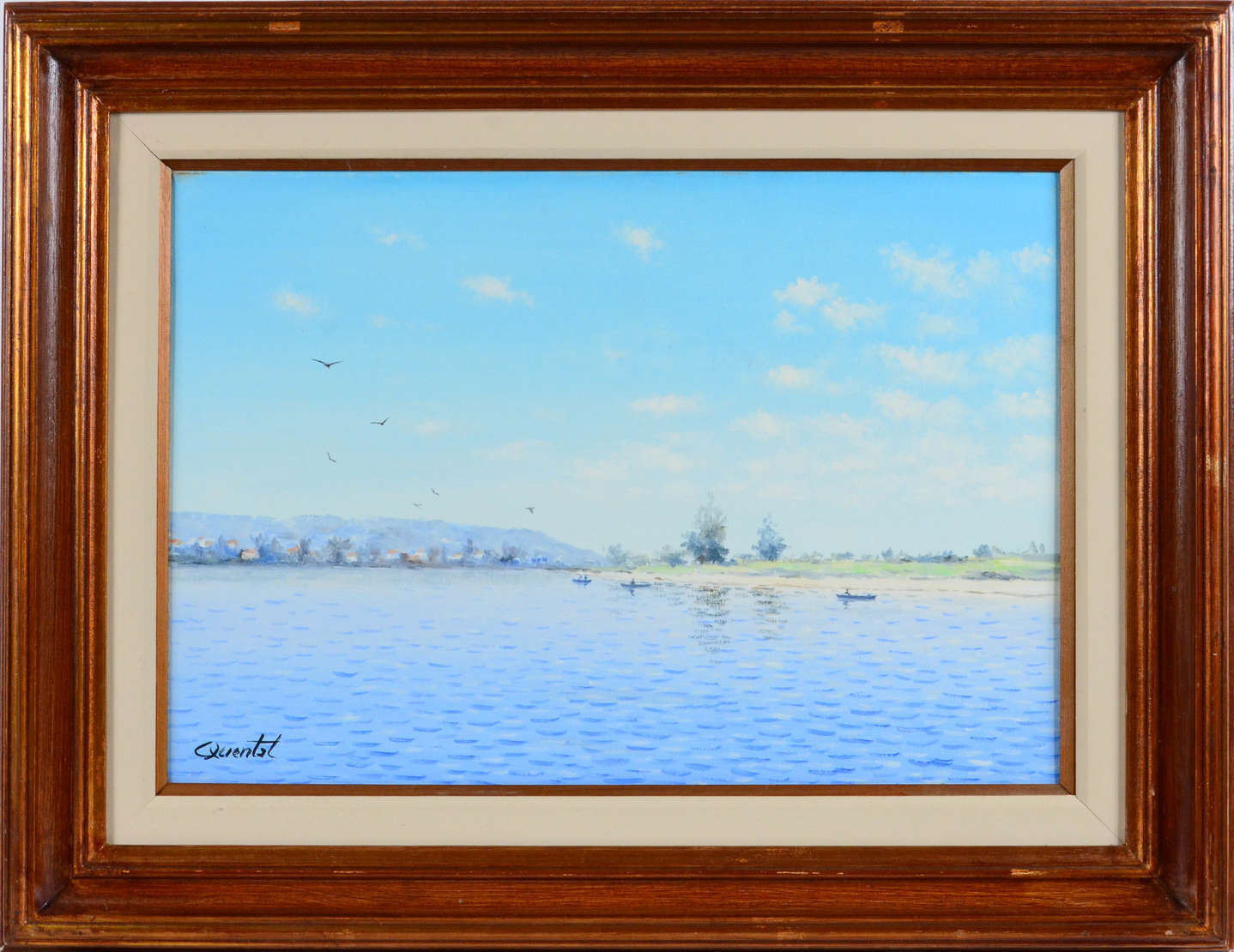 Par de quadros orientais de tecido vermelho com bordados, assinados.