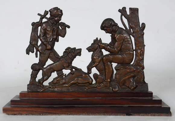 Placa decorativa de bronze representando ¨caçadores ¨ , base de madeira.