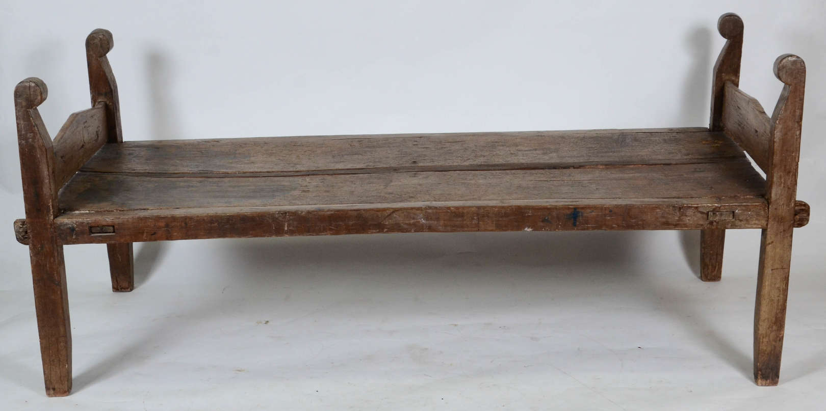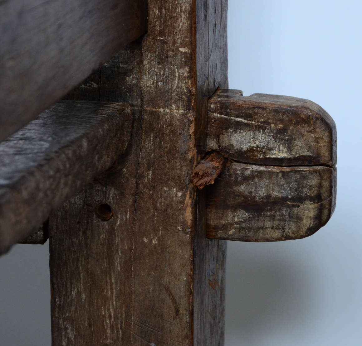 Antiga Cadeira baixa (Swati Peeray) tibetana, de madeira entalhada e assento de palha, feito artesanalmente à mão.