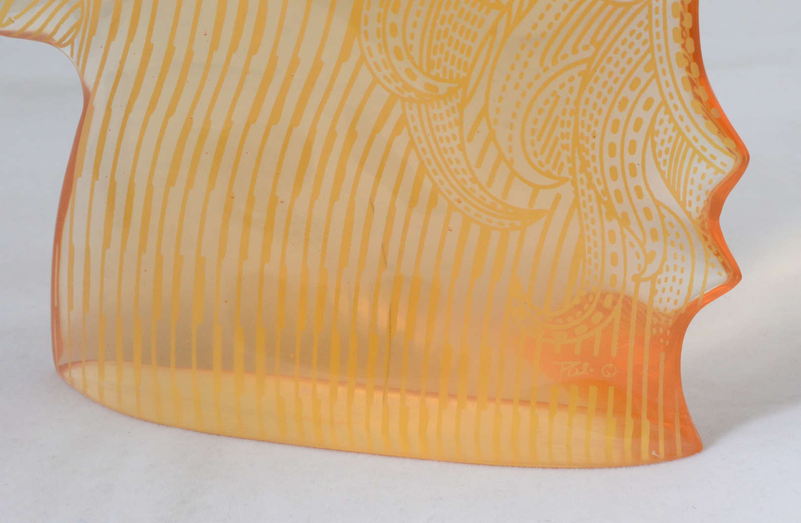 Placa decorativa de bronze representando ¨caçadores ¨ , base de madeira.