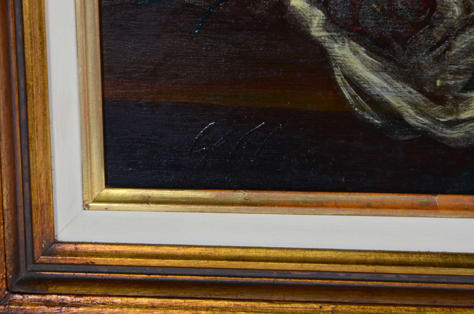Par de quadros orientais de tecido vermelho com bordados, assinados.