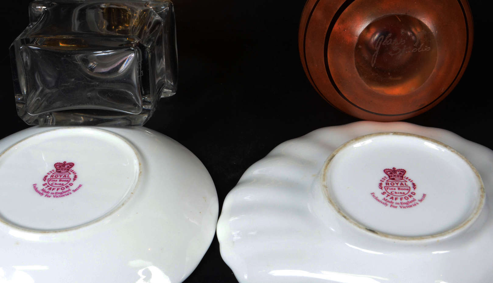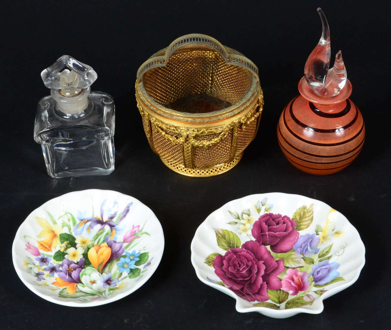 Sete pequenas peças orientais de porcelana, metal e outros materiais.