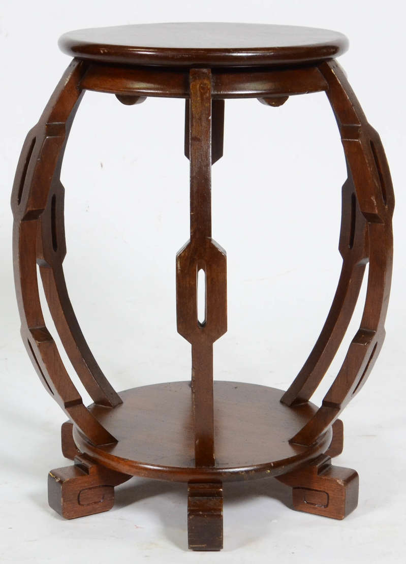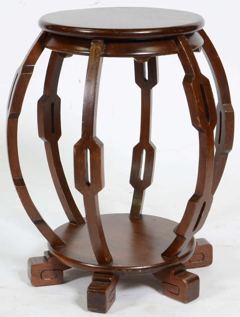 Porta bibelot de madeira nobre com pequenas prateleiras, laterais com frisos vazados.
