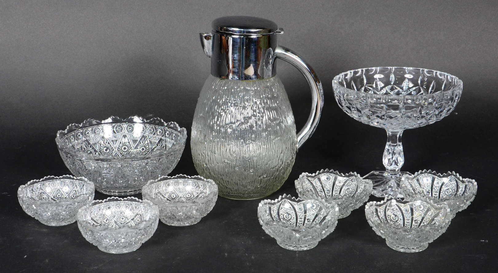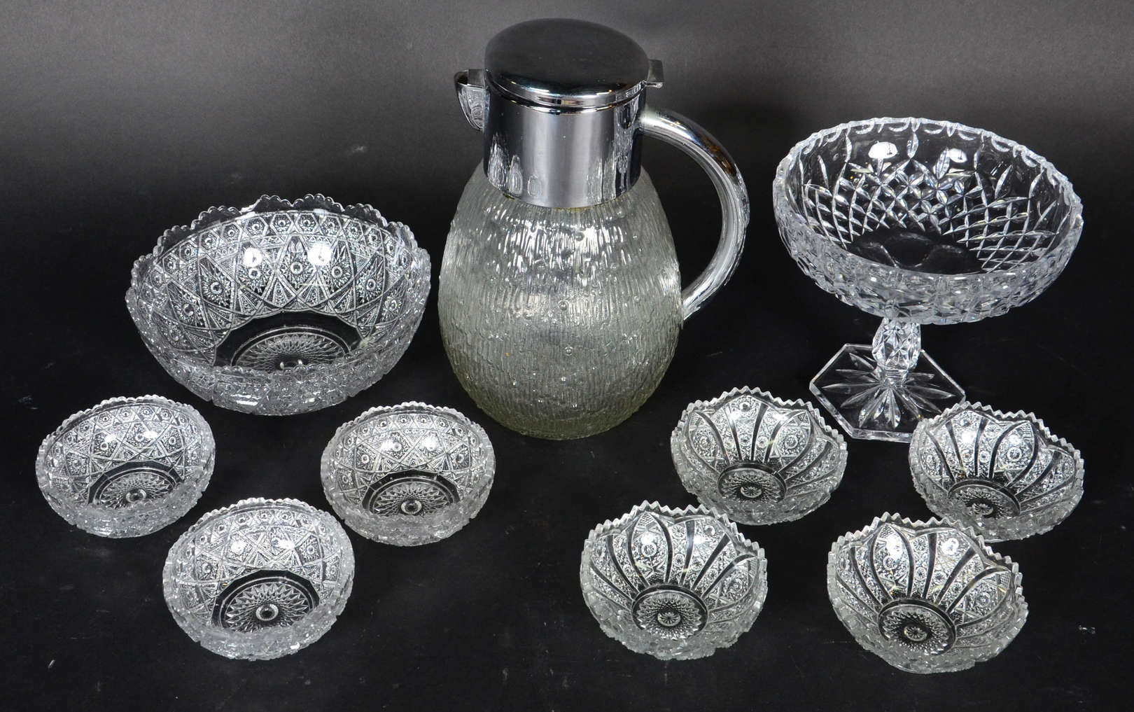 Diversas peças , sendo pequena fruteira de cristal lapidado e saladeira com 7 bowls , 3 diferentes e jarra de água . Total 10 peças