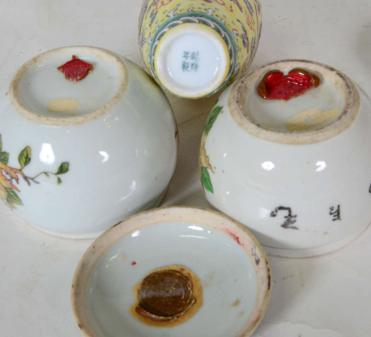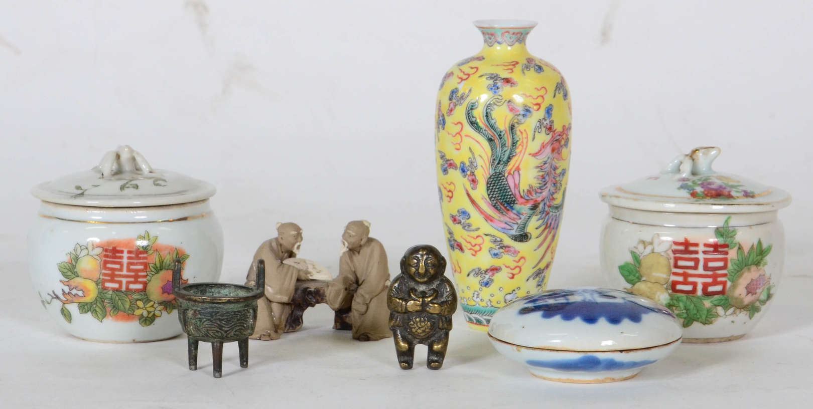 Cinco peças diversas, sendo: bomboniere de metal dourado filigranado, 2 bowls de porcelana floral e 2 perfumeiros .