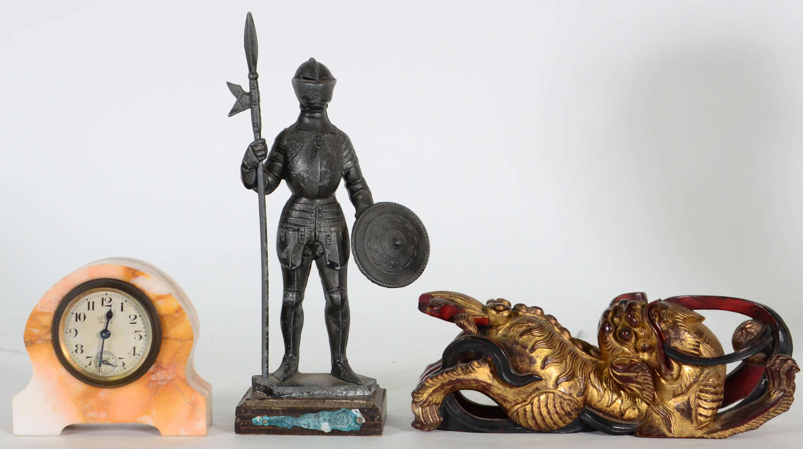 Três peças sendo 1 relógio de mármore , 1 escultura de soldado e 1 escultura de madeira representando dragão