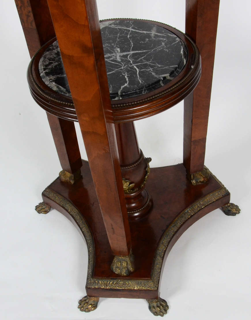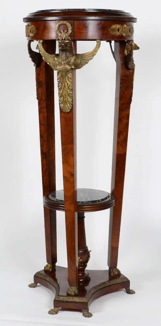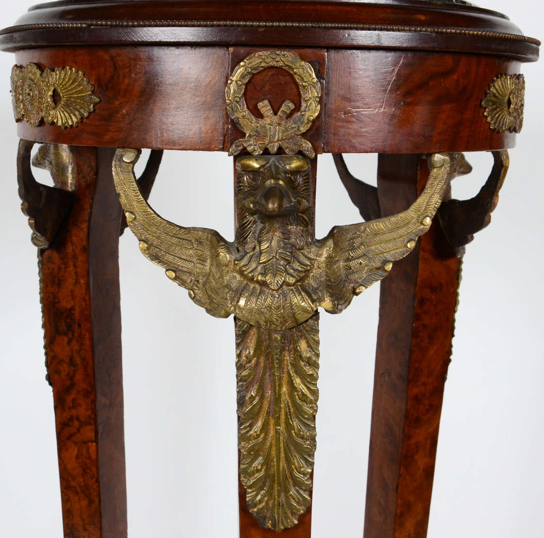 Mesa redonda de madeira nobre, aplicações de bronze representando animais estilizados, tampo de mármore.