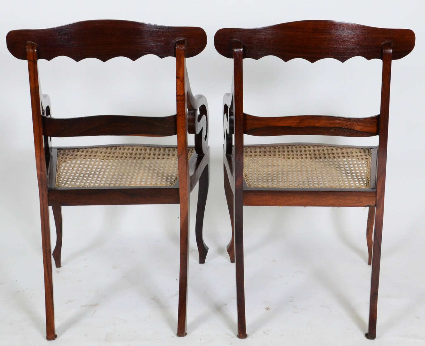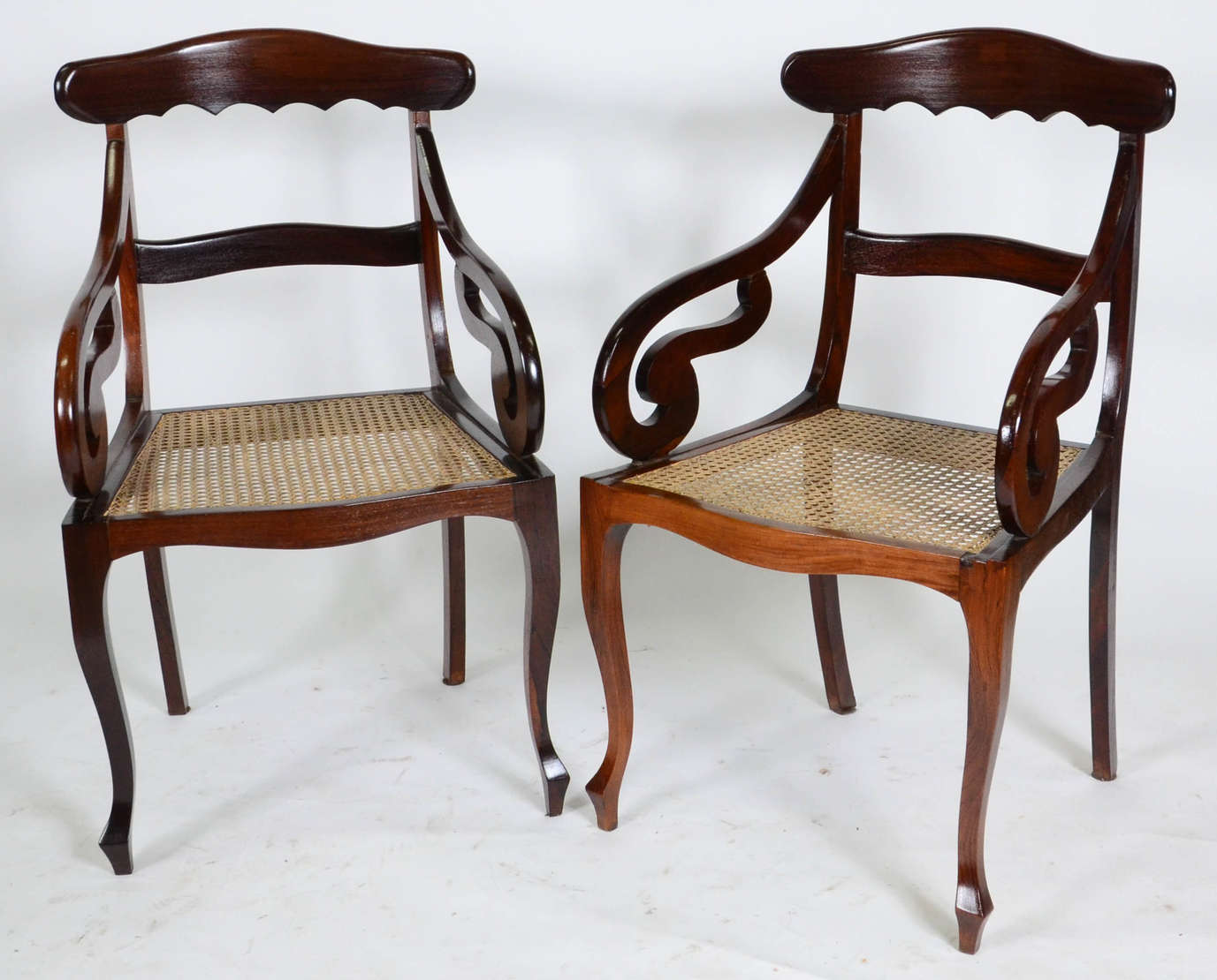 Duas cadeiras no estilo Boulle, encostos e assentos estofados.