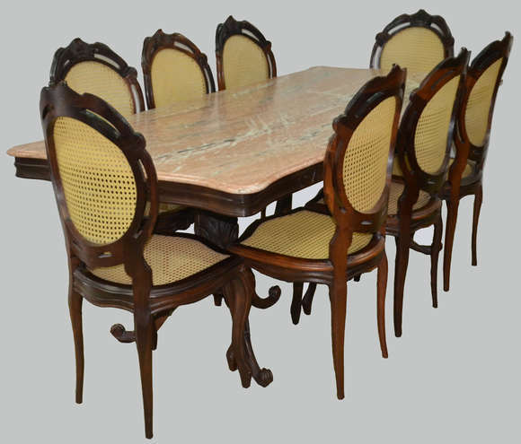 Mesa de jantar de jacarandá com tampo de mármore e 8 cadeiras medalhão duplo de jacarandá e forração de palhinha.