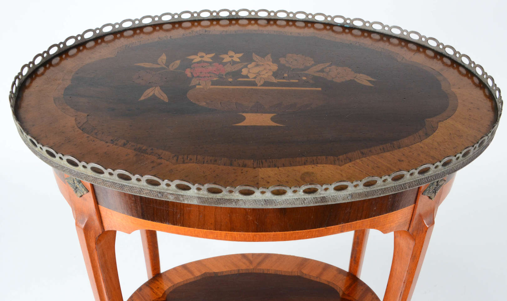 Cômoda estilo frances, feitio bombé, duas gavetas , laterais e tampo trabalhados em marqueterie floral, aplicações d...