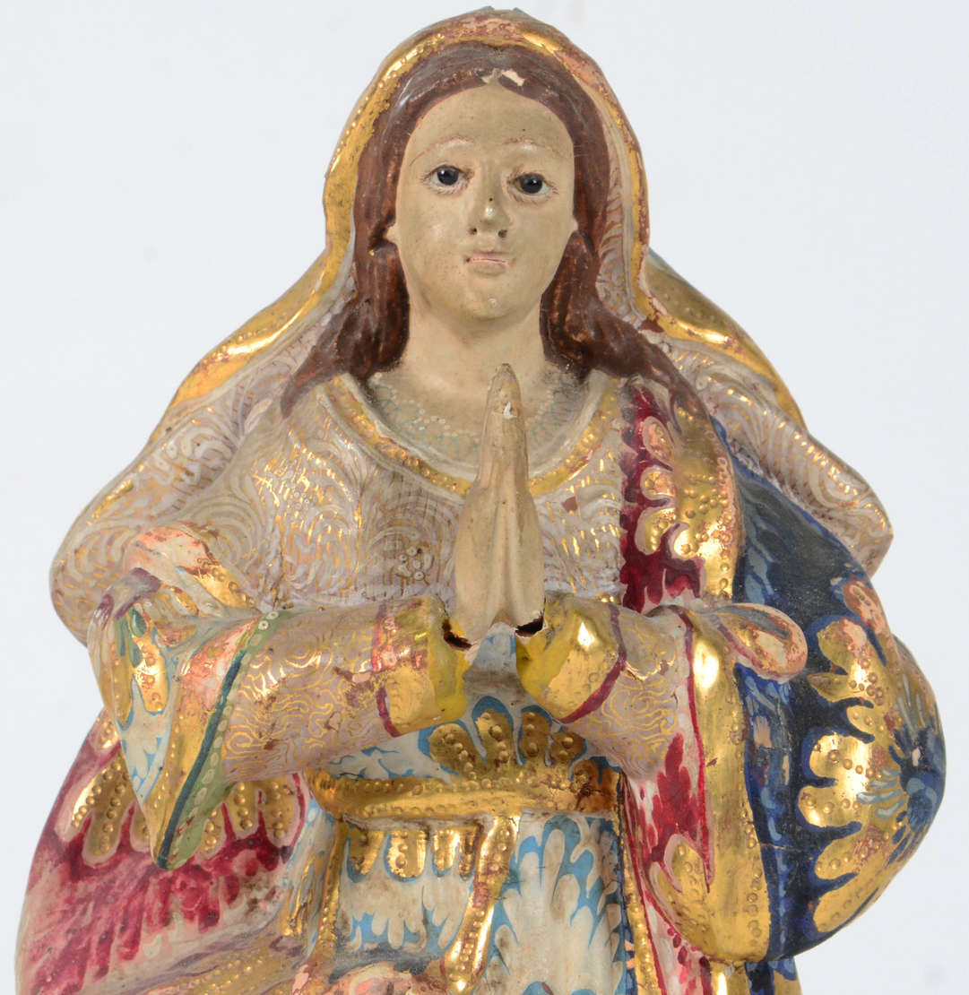 Nossa Senhora com flor numa das mãos e menino – Antiga imagem indo portuguesa em madeira dourada e policromada, roche...