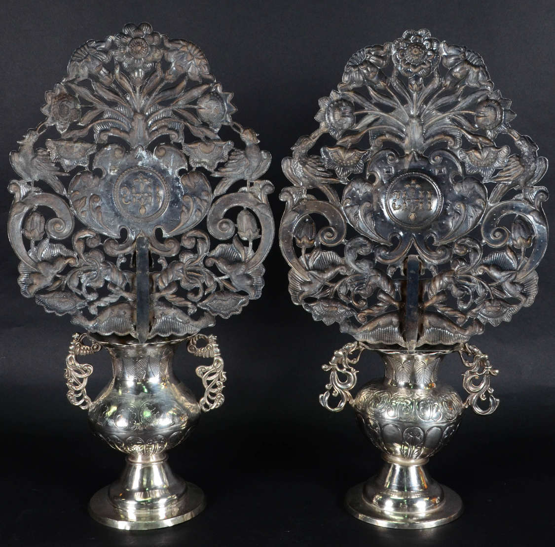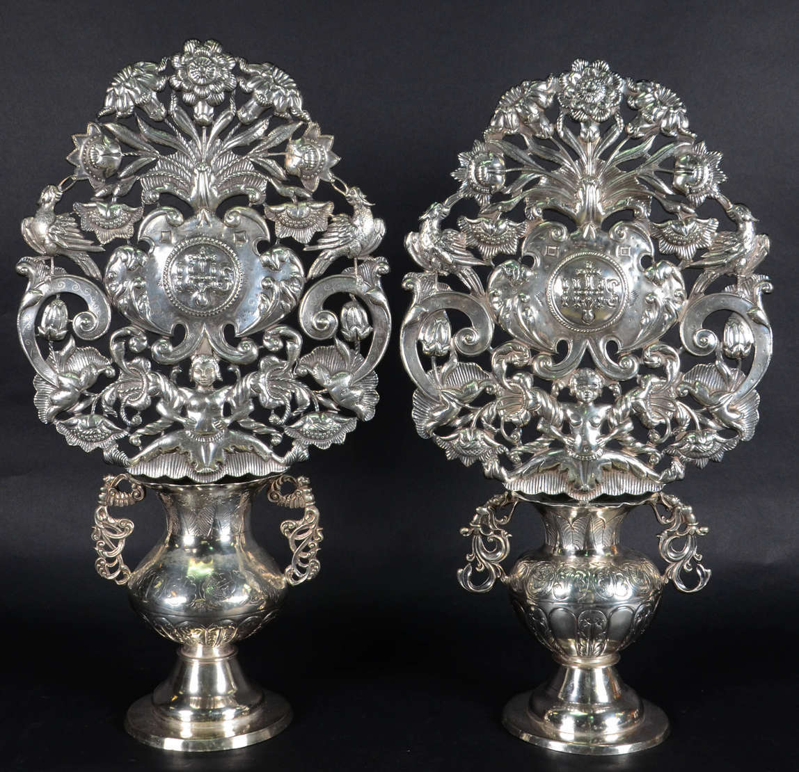 Par de castiçais de prata russa ricamente trabalhados com guirlandas florais, segunda metade do sec.XIX, .