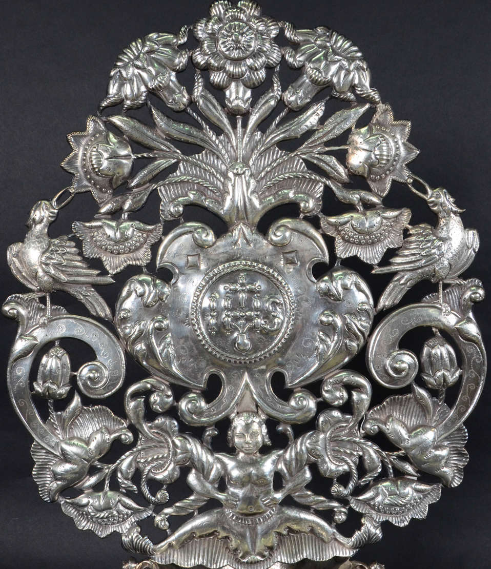 Salva de prata contraste 935 mls, centro decorado com figuras de anjos em relevo, borda vazada com guirlandas florais...