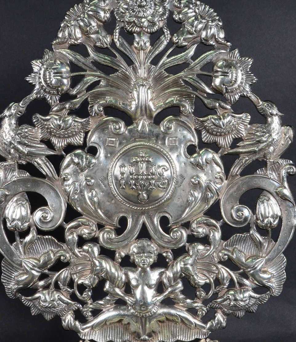 Salva de prata 833 contrastada, fundo decorado com anjos em relevo, borda vazada com guirlandas florais.