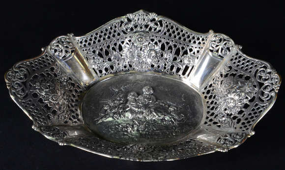 Salva de prata 833 contrastada, fundo decorado com anjos em relevo, borda vazada com guirlandas florais.