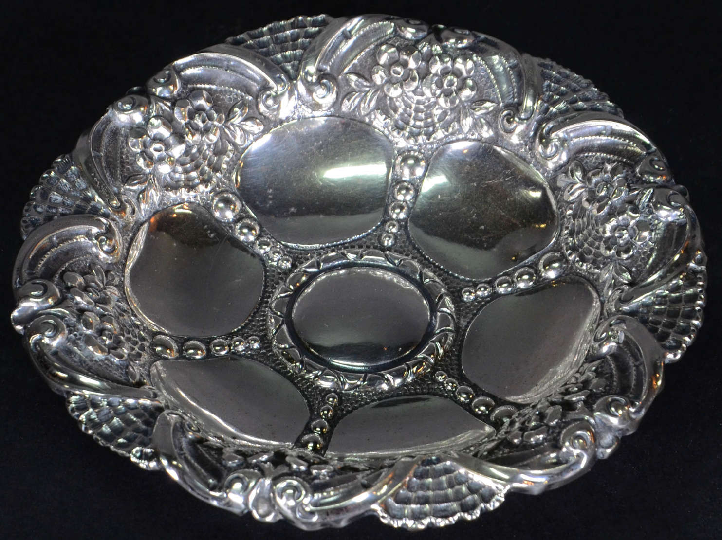 Salva de prata contraste J Coroa, borda recortada com flores em relevo, pes de garra.