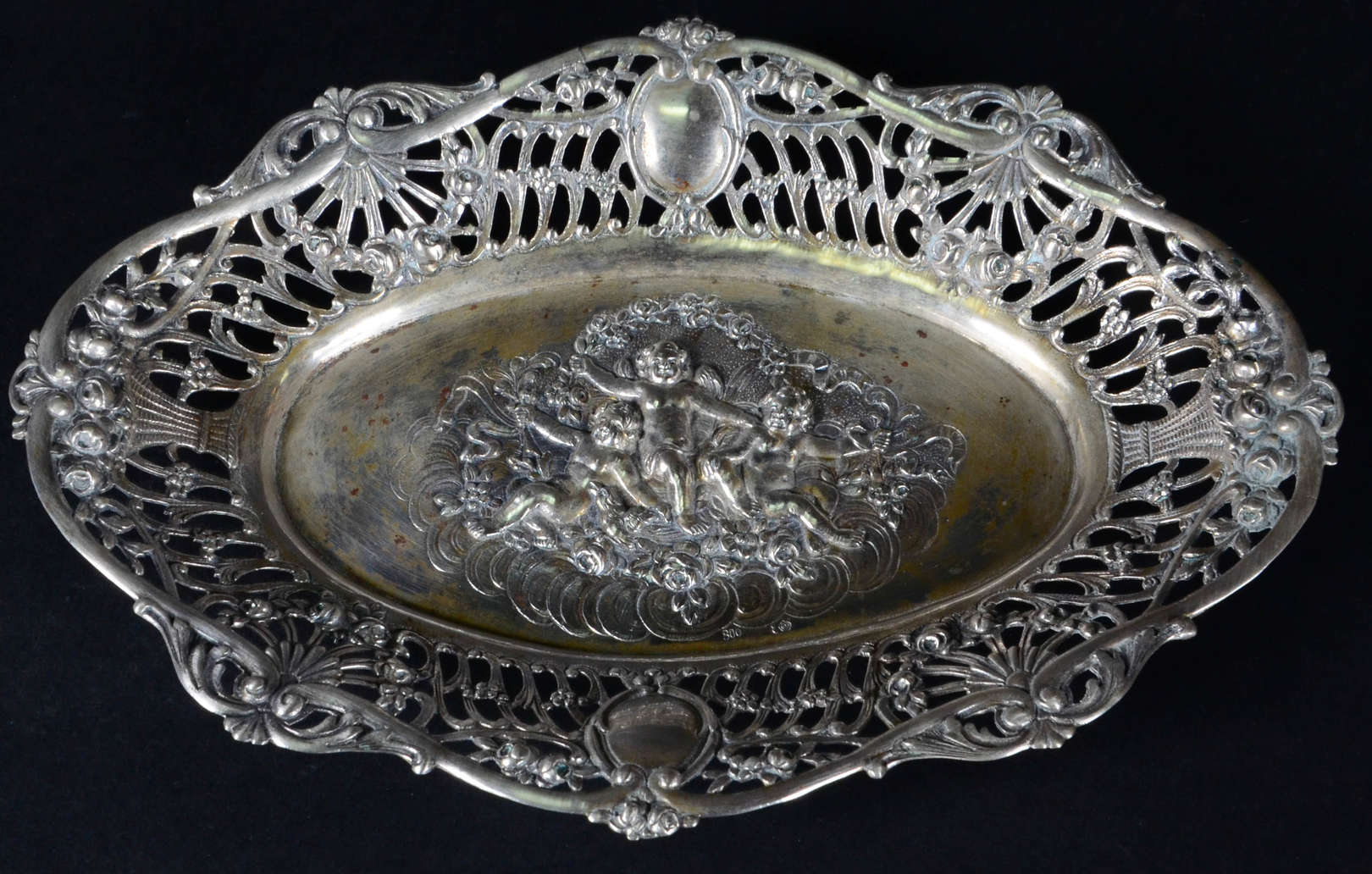 Salva de prata 833 contrastada, fundo decorado com anjos em relevo, borda vazada com guirlandas florais.