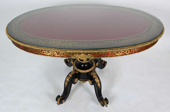 Mesa oval com coluna central de 4 pés , Napoleão III. Boulle em laca preta encrustações em metal dourado e " T...