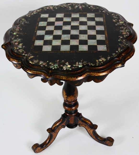 Mesa tilt -top Vitoriana século XIX de madeira ebanizada com incrustaçoes de madrepérola e centro com tampo de xadr...
