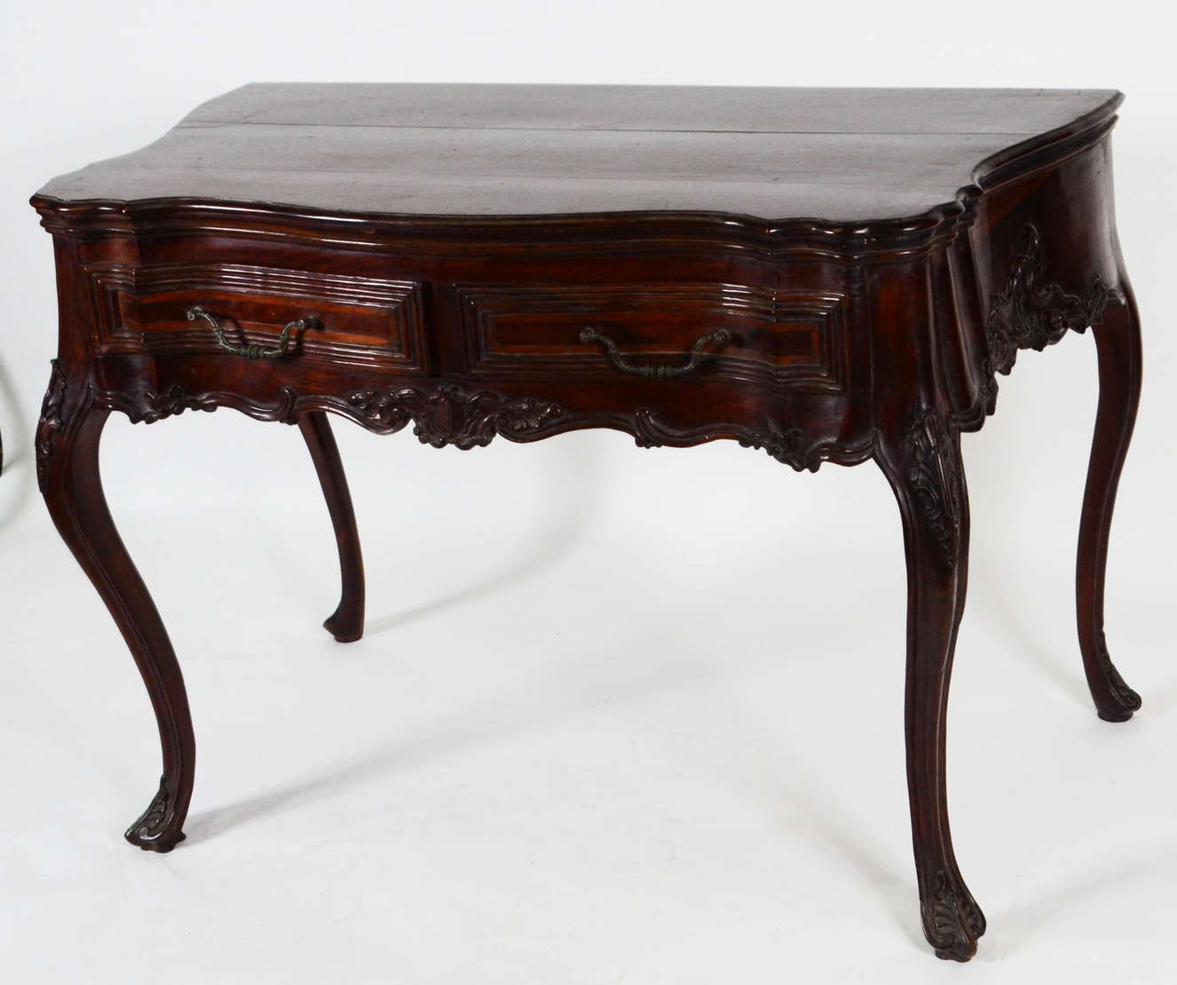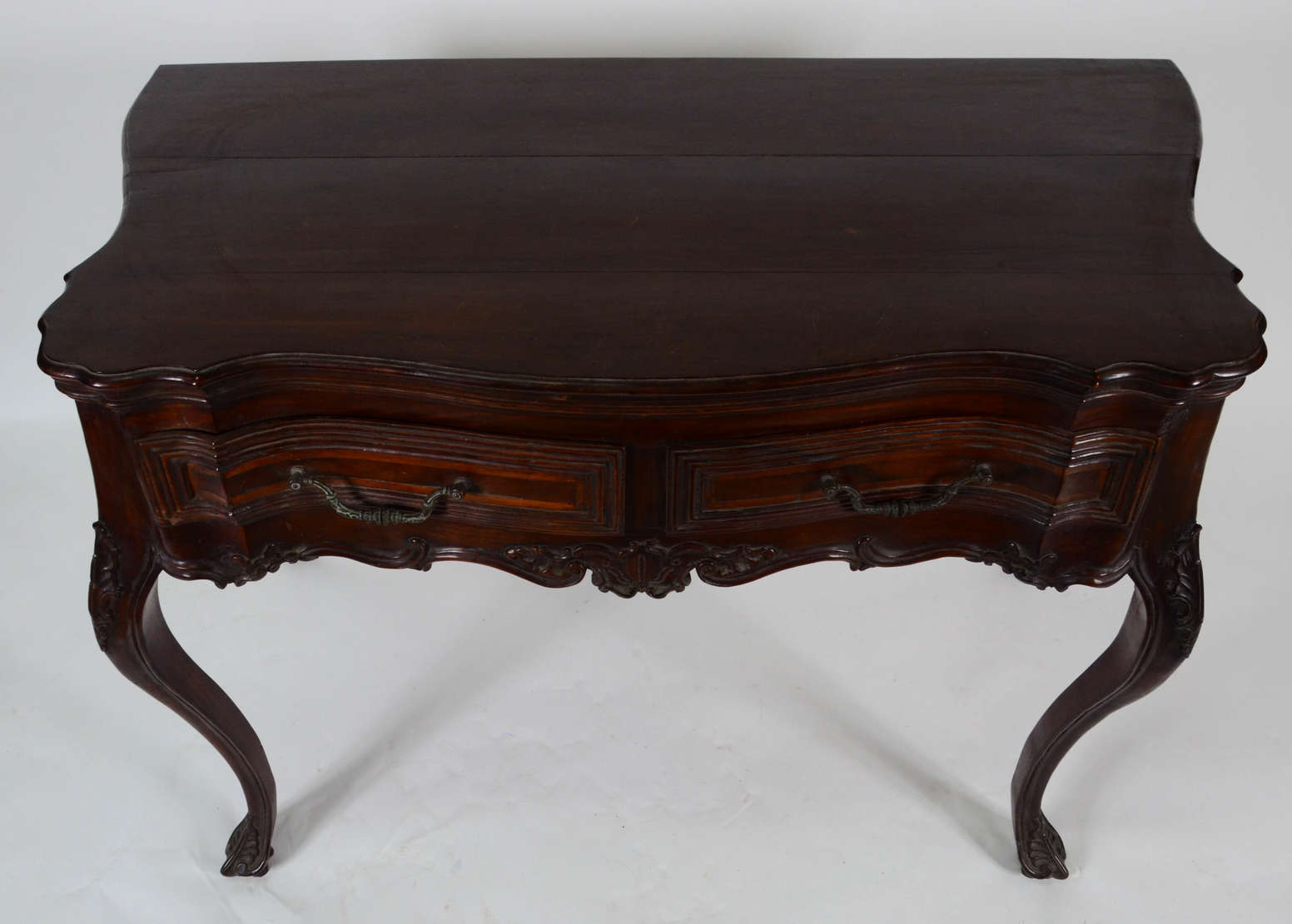 Movel cômoda/papeleira abatant com incrustações de madrepérola e metal dourado.