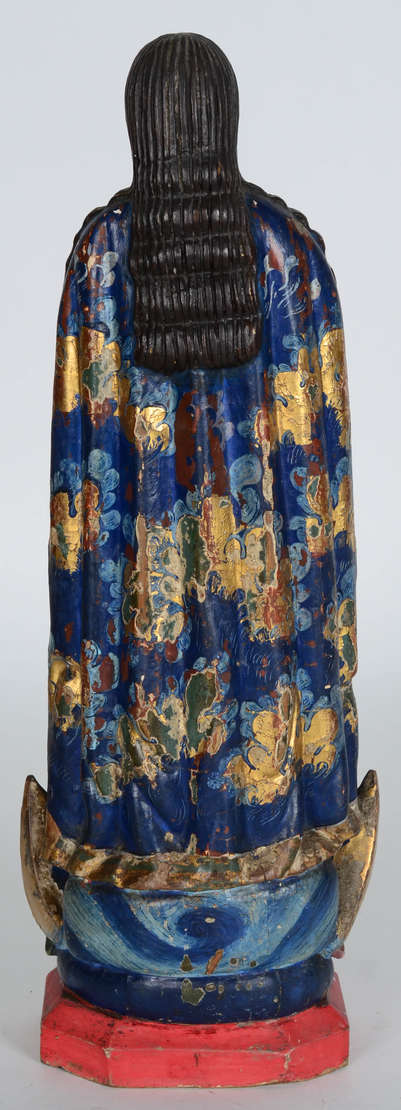 Escultura de madeira japonesa policromada e dourada representando figura com cântaro.