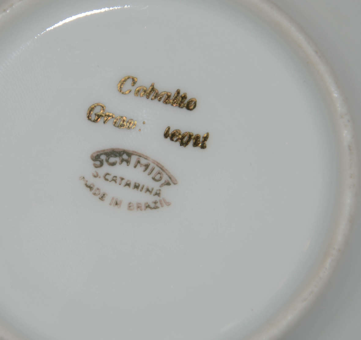 Aparelho de jantar de porcelana Real na cor branca , borda com friso vinho e realces dourados , composto de 13 prat...