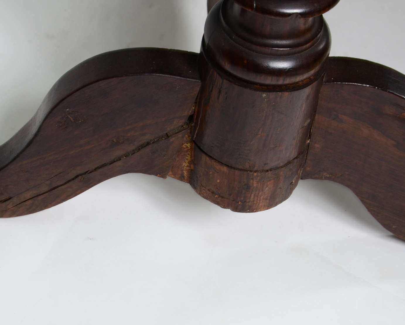Mesa de madeira nobre, tampo redondo, base torneada com coluna central terminando em 3 perna