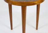 Mesa de madeira nobre, tampo redondo, base torneada com coluna central terminando em 3 perna